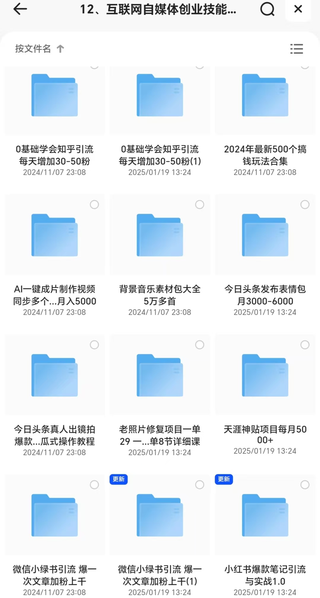选择比努力更为重要,与谁同行要比去的远方更为重要。分享多年互联网技能学习资料,包括短视频、自媒体等,高清无水印,适合副业赚钱。纯公益,无需付费,资源链接在文末,建议先转存避免失效。曾经我想学个短视频、自媒体却总是被人割韭菜!从2009年到今天,单学费都交了十几万了,交付就是一个网盘,主打一个妥妥的被割。资料太多了,换了新电脑,昨晚整理下,仅保留了自2018年以来,自己操作过有点成绩的项目,一共有168个项目干货,和自媒体人必备的工具和若干多素材,若有需要,说声谢谢,我送你。里面可以找到短视频、自媒体、视频剪辑、闲鱼无货源等各种各样的互联网方面的技能课程,课程画质很清晰、没有水印,算是课程中的高品质了。曾淋过雨,我愿为你撑起一把伞,如果你要找互联网方面的技能教学作为副业赚钱项目,你就不用到处给人家交学费了,关键还1毛钱都不用花,纯公益,大家如果操作也出成绩了,麻烦回来微信:Gsh139797 反馈一声!未完会继续上传更多,敬请期待......